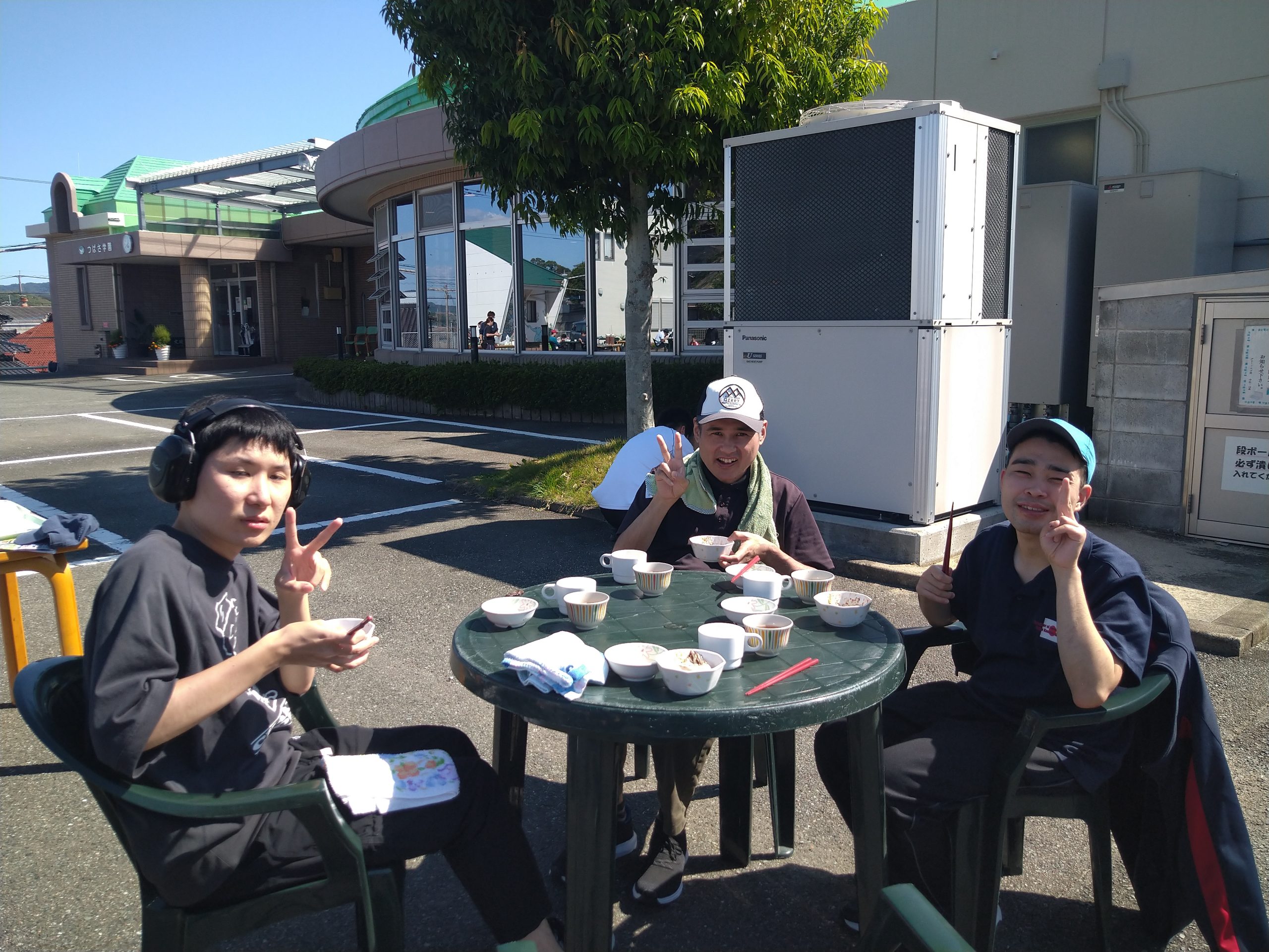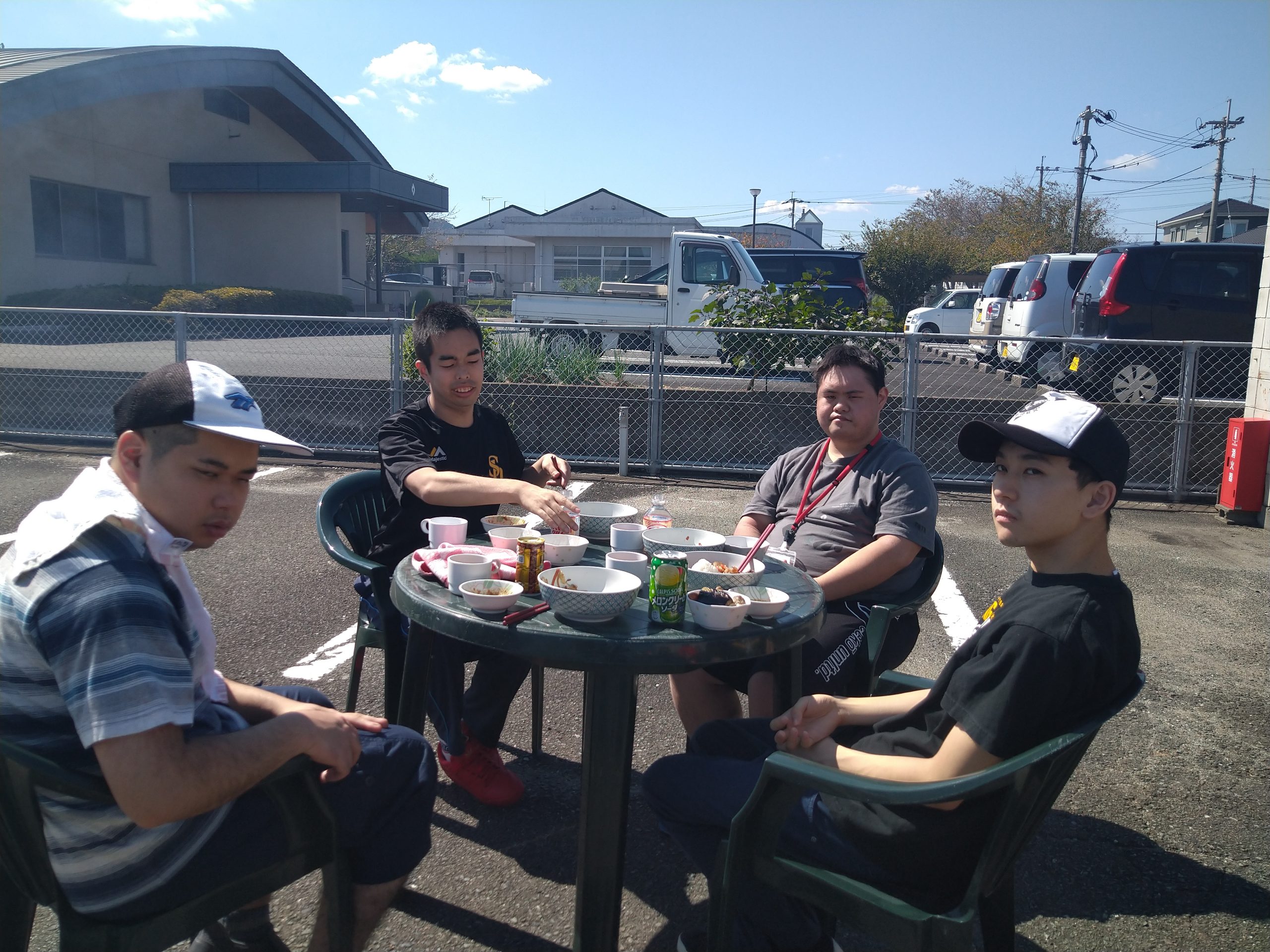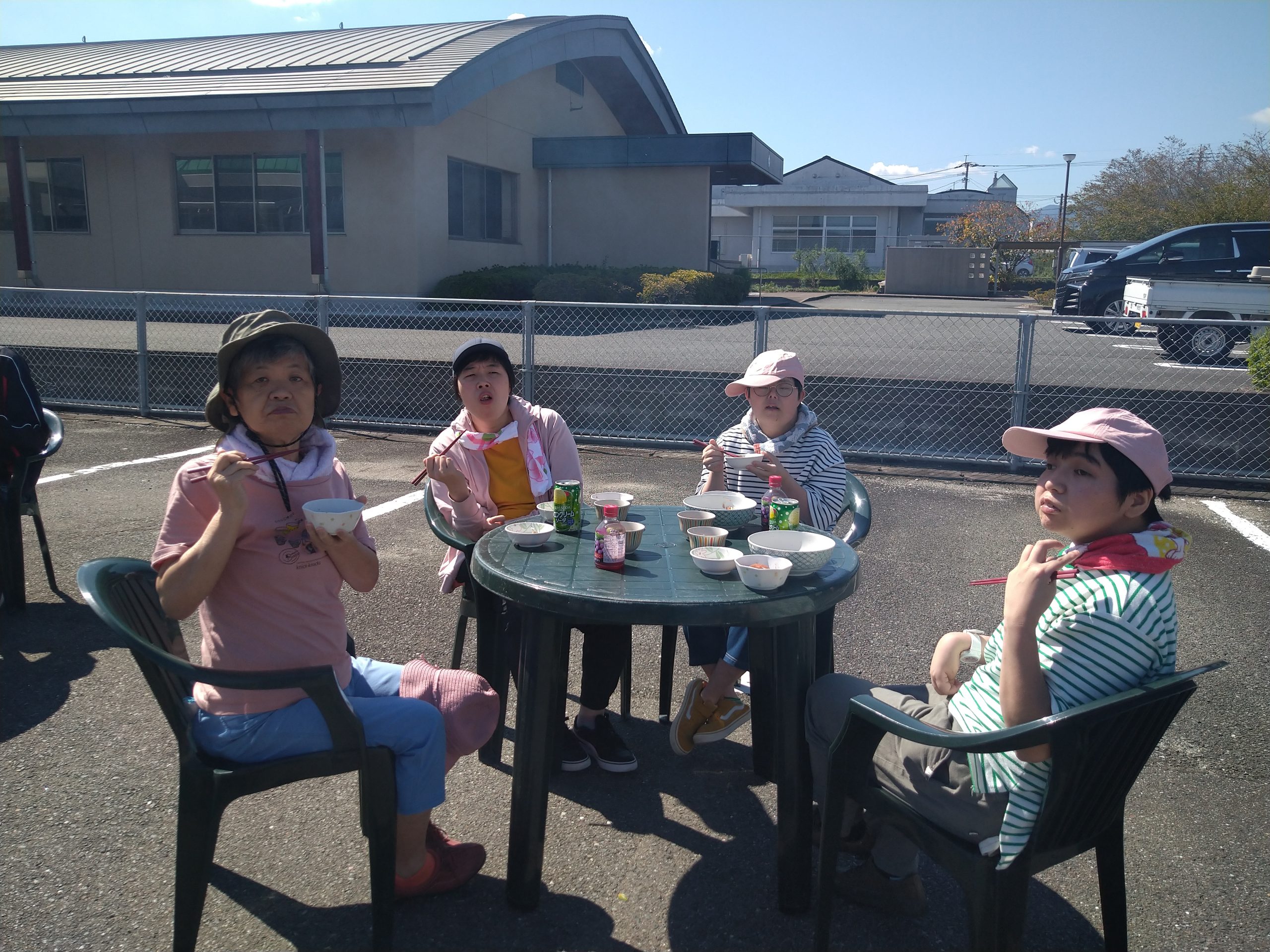 10月11日(金)嘉麻事業所園庭にてバーベキュー大会を開催しました。当日は、皆さんや職員の日頃の行いを見て頂けているのか。。。雲一つ無い晴天( *´艸`)朝食後より園庭にて準備している職員を見てソワソワ♬待ちきれずに手伝いに出て来られる方も沢山居ました。準備が完了し、バーベキュー開始!たくさんのお肉や焼きおにぎり、焼きそばに野菜、事前に購入されたジュースを堪能され、大満足の一日となりました(#^^#)