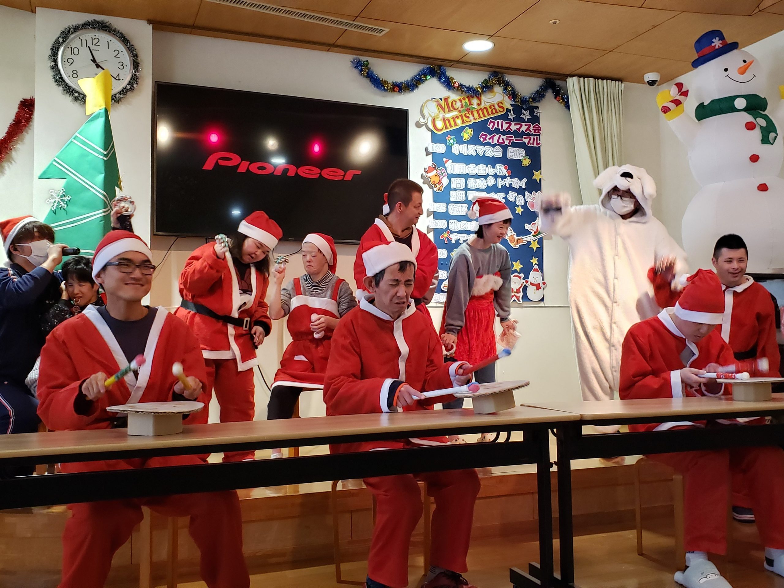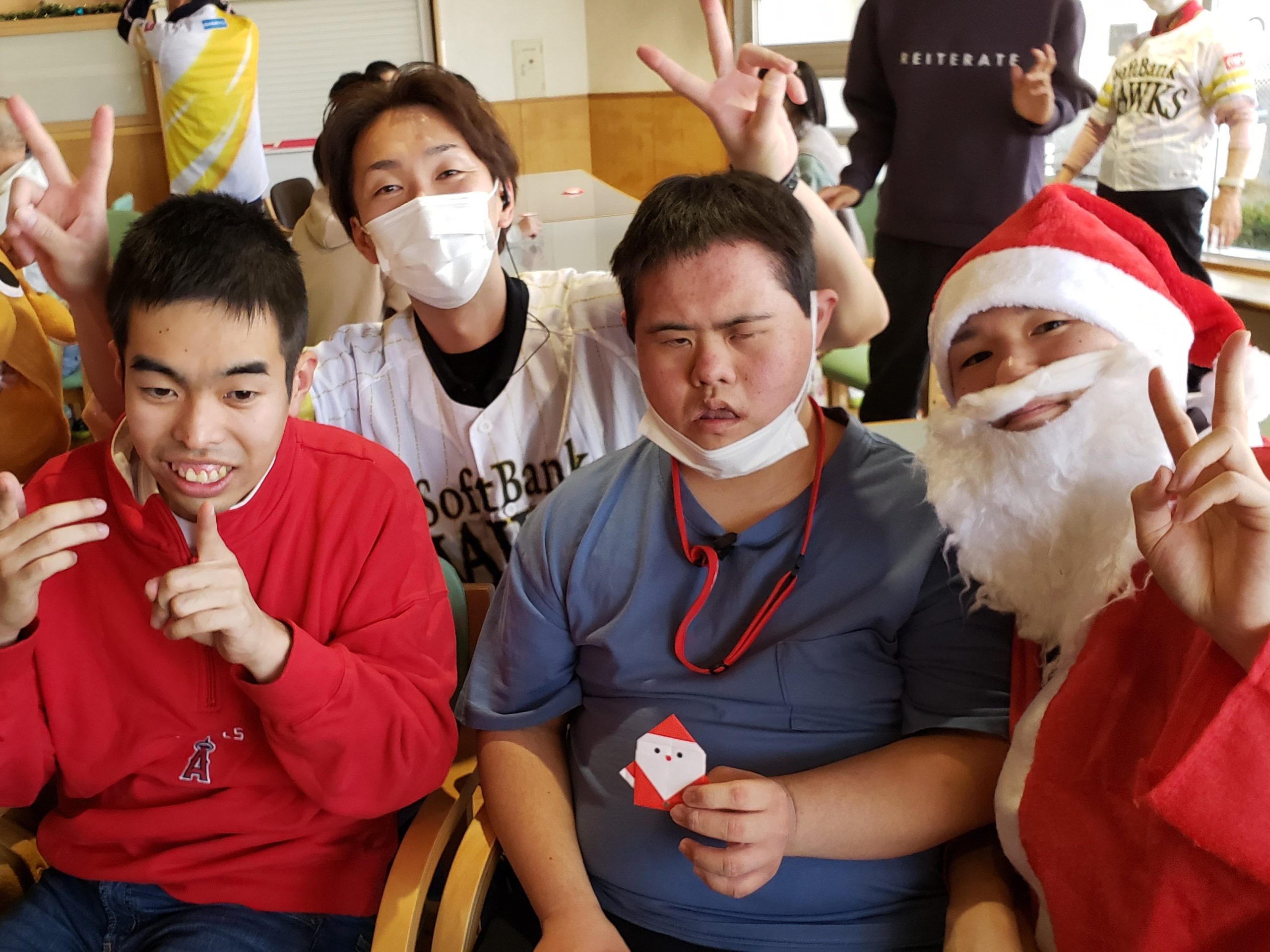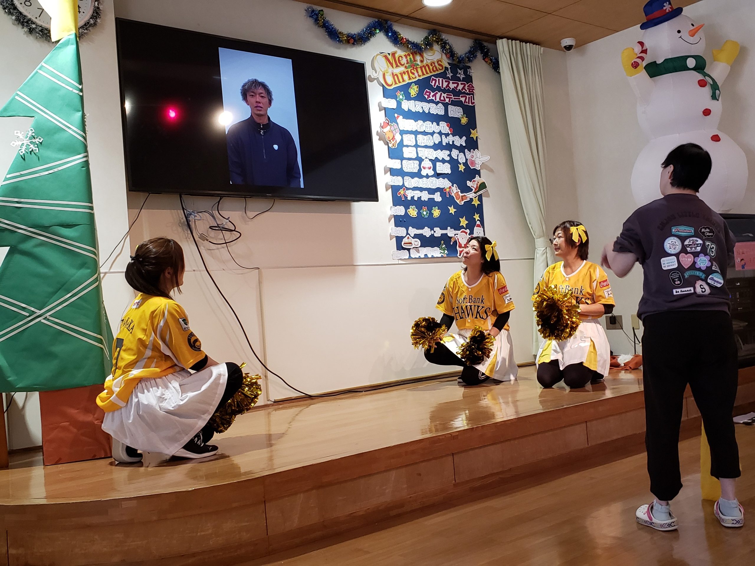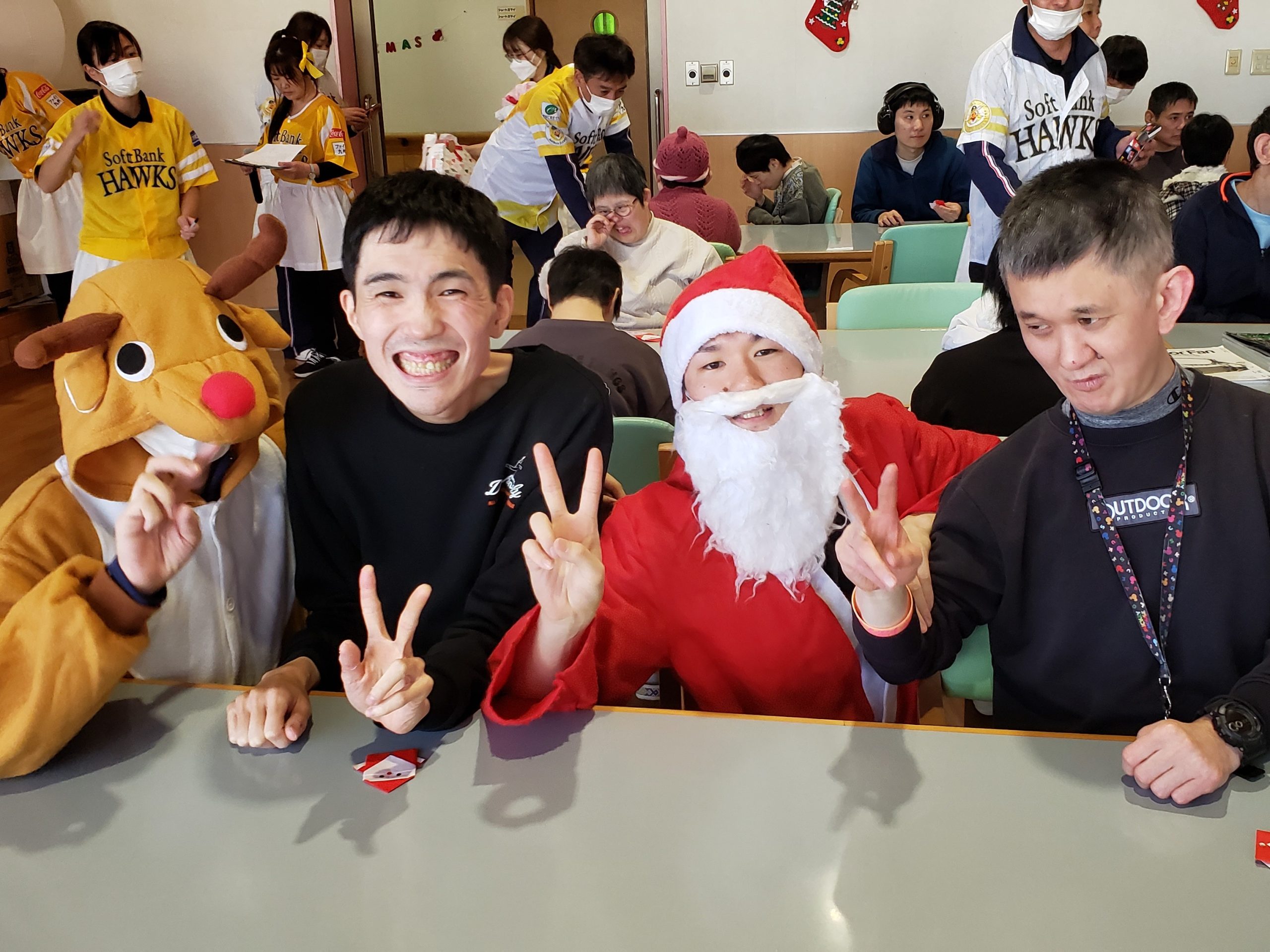12月23日(月)嘉麻事業所にて毎年恒例クリスマス会を開催しました(#^^#)午前の部は皆さんによる出し物♬流行りの音楽に合わせて太鼓の演奏やダンスを踊る等して会場をおおいに盛り上げて頂きました!その後は豪華な昼食とおやつを食べ、午後の部からは職員による出し物開始!まずは歌のお姉さん、体操のお姉さんによる歌・踊りの出し物♪皆さんプレゼントを頂いたり、一緒に踊ったりと楽しいひと時となりました。2番目の出し物はソフトバンクホークス応援団のチアリーディング(*’▽’)こちらも皆さん大盛り上がりとなり、終盤には今宮選手からのつばさ学園へ向けたサプライズビデオレターが流れ、皆さん大興奮されていました。最後には恒例のサンタ・トナカイによるプレゼント贈呈♬それぞれ願いを込めたプレゼントが届いたようで、とても嬉しそうな様子を見る事が出来ました(*’▽’)