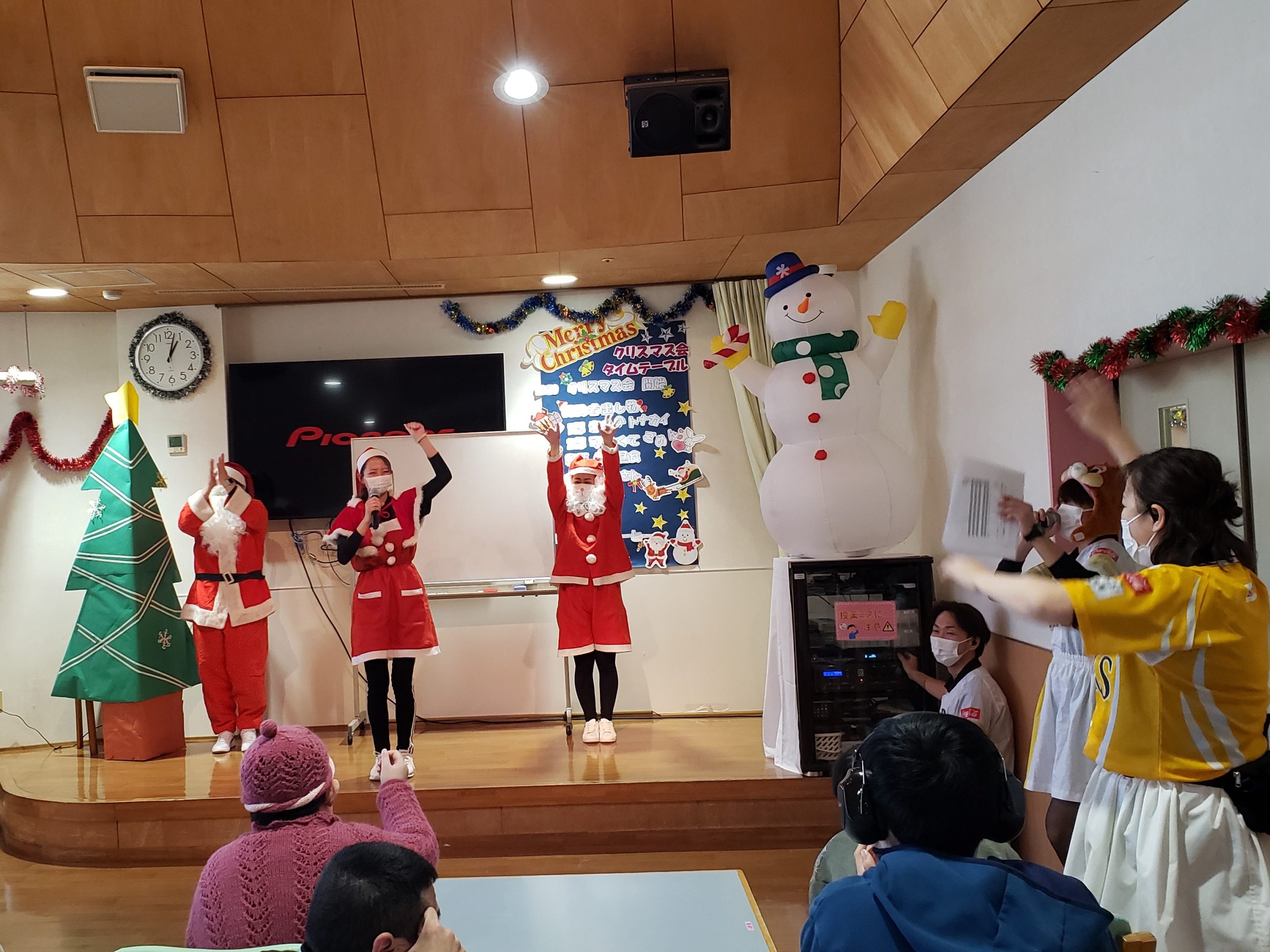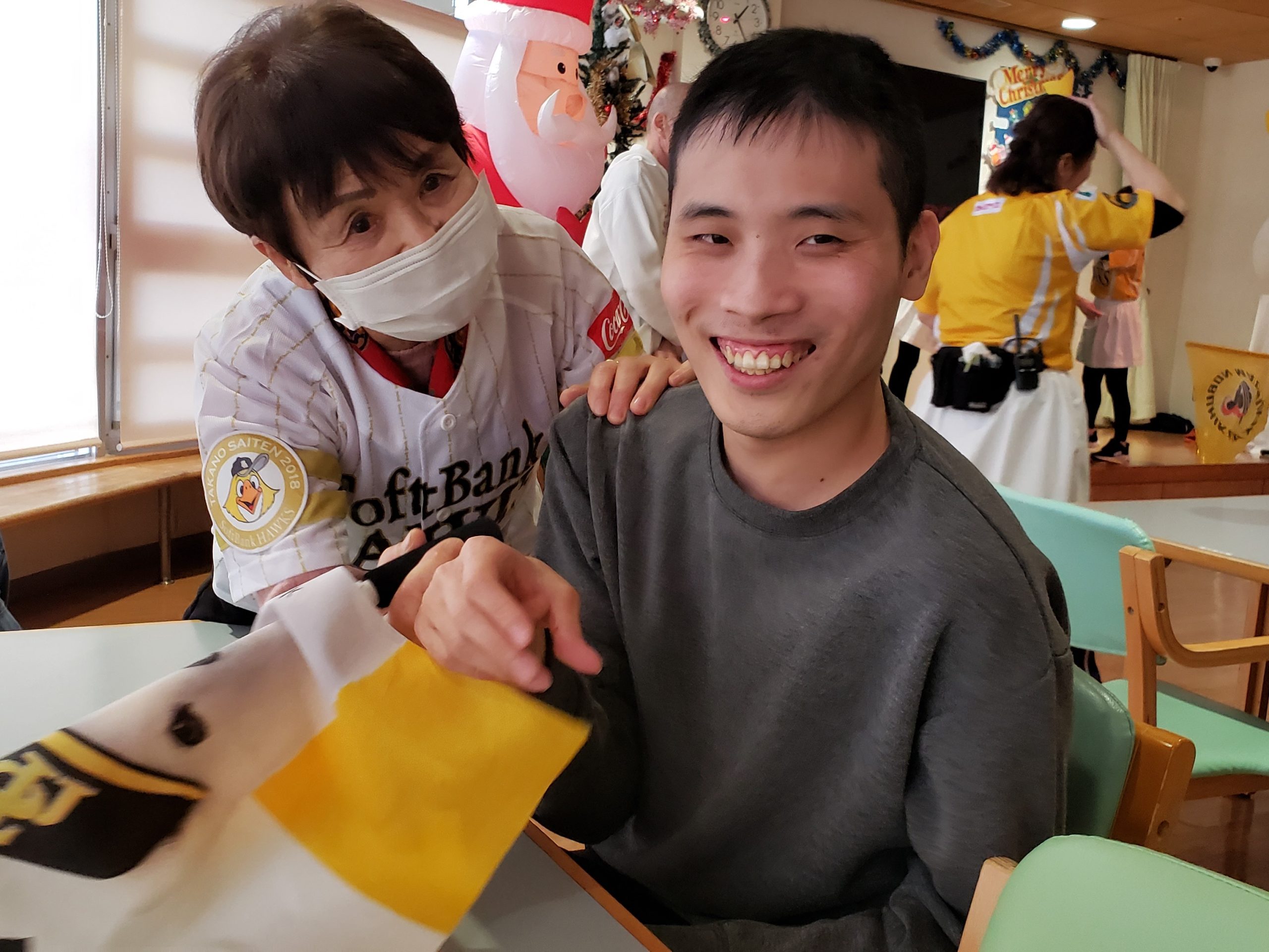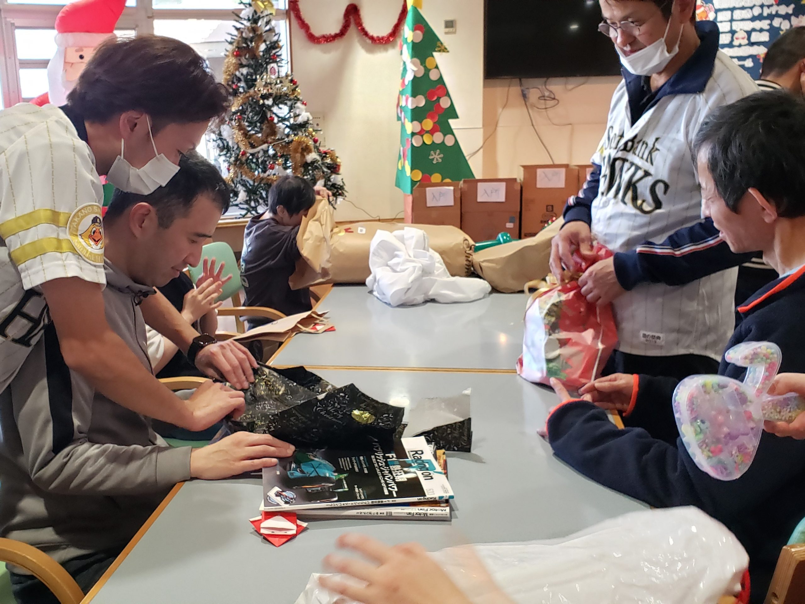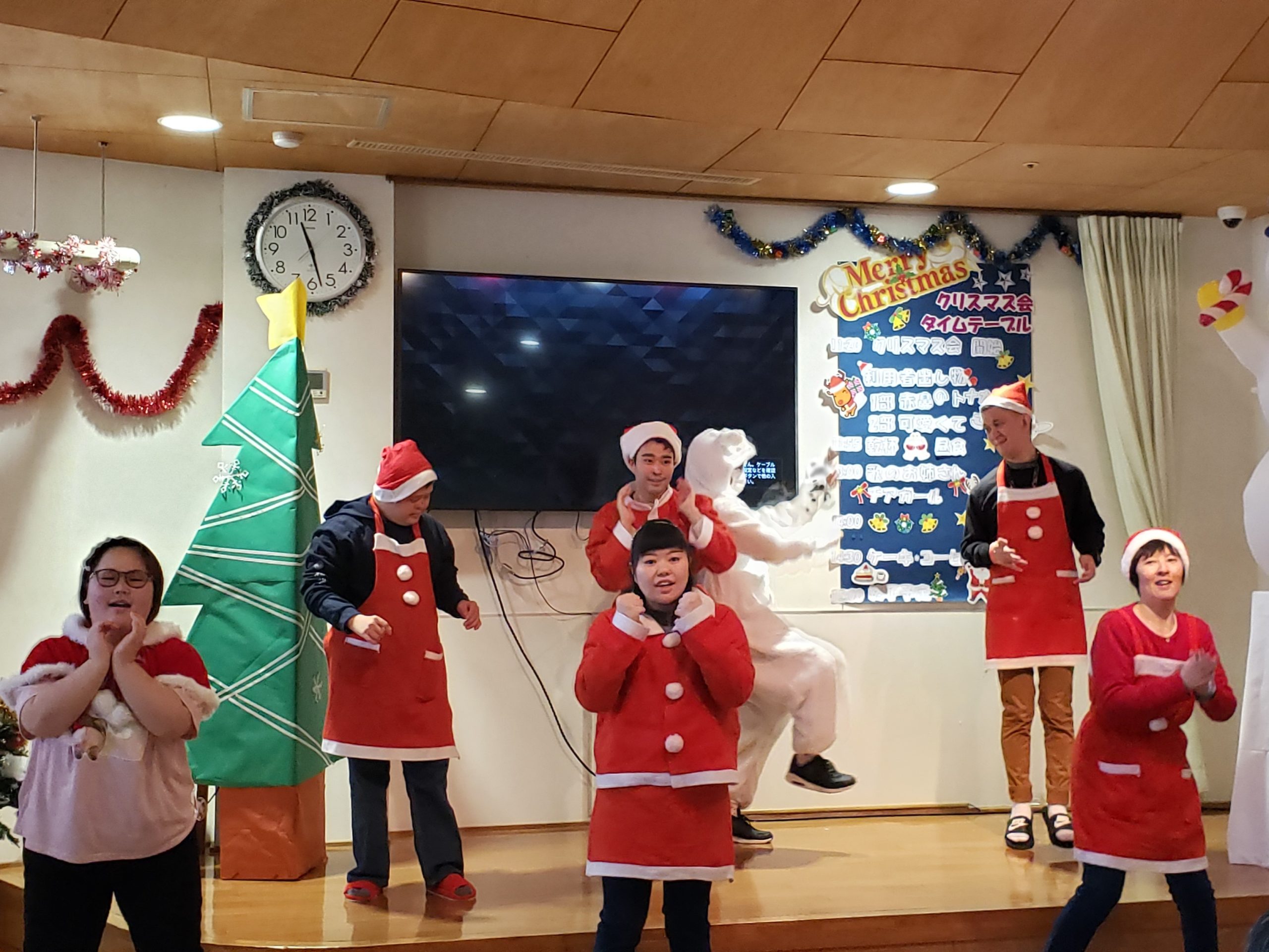 12月23日(月)嘉麻事業所にて毎年恒例クリスマス会を開催しました(#^^#)午前の部は皆さんによる出し物♬流行りの音楽に合わせて太鼓の演奏やダンスを踊る等して会場をおおいに盛り上げて頂きました!その後は豪華な昼食とおやつを食べ、午後の部からは職員による出し物開始!まずは歌のお姉さん、体操のお姉さんによる歌・踊りの出し物♪皆さんプレゼントを頂いたり、一緒に踊ったりと楽しいひと時となりました。2番目の出し物はソフトバンクホークス応援団のチアリーディング(*’▽’)こちらも皆さん大盛り上がりとなり、終盤には今宮選手からのつばさ学園へ向けたサプライズビデオレターが流れ、皆さん大興奮されていました。最後には恒例のサンタ・トナカイによるプレゼント贈呈♬それぞれ願いを込めたプレゼントが届いたようで、とても嬉しそうな様子を見る事が出来ました(*’▽’)