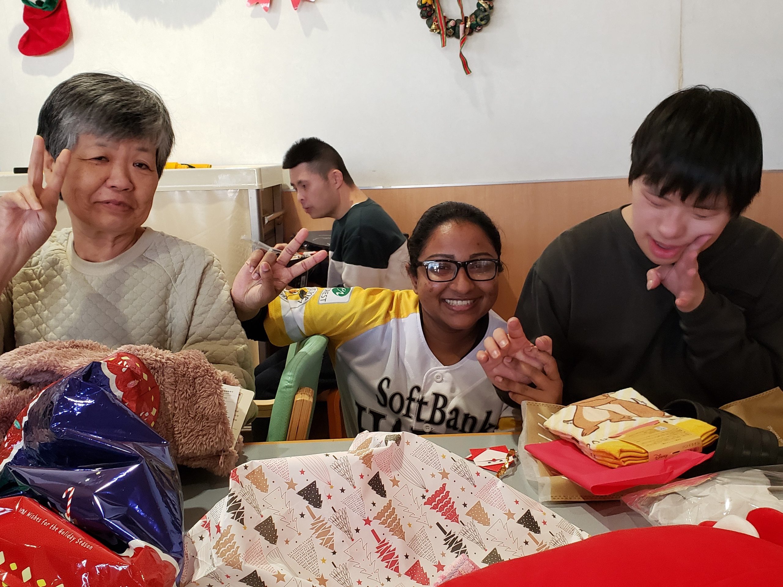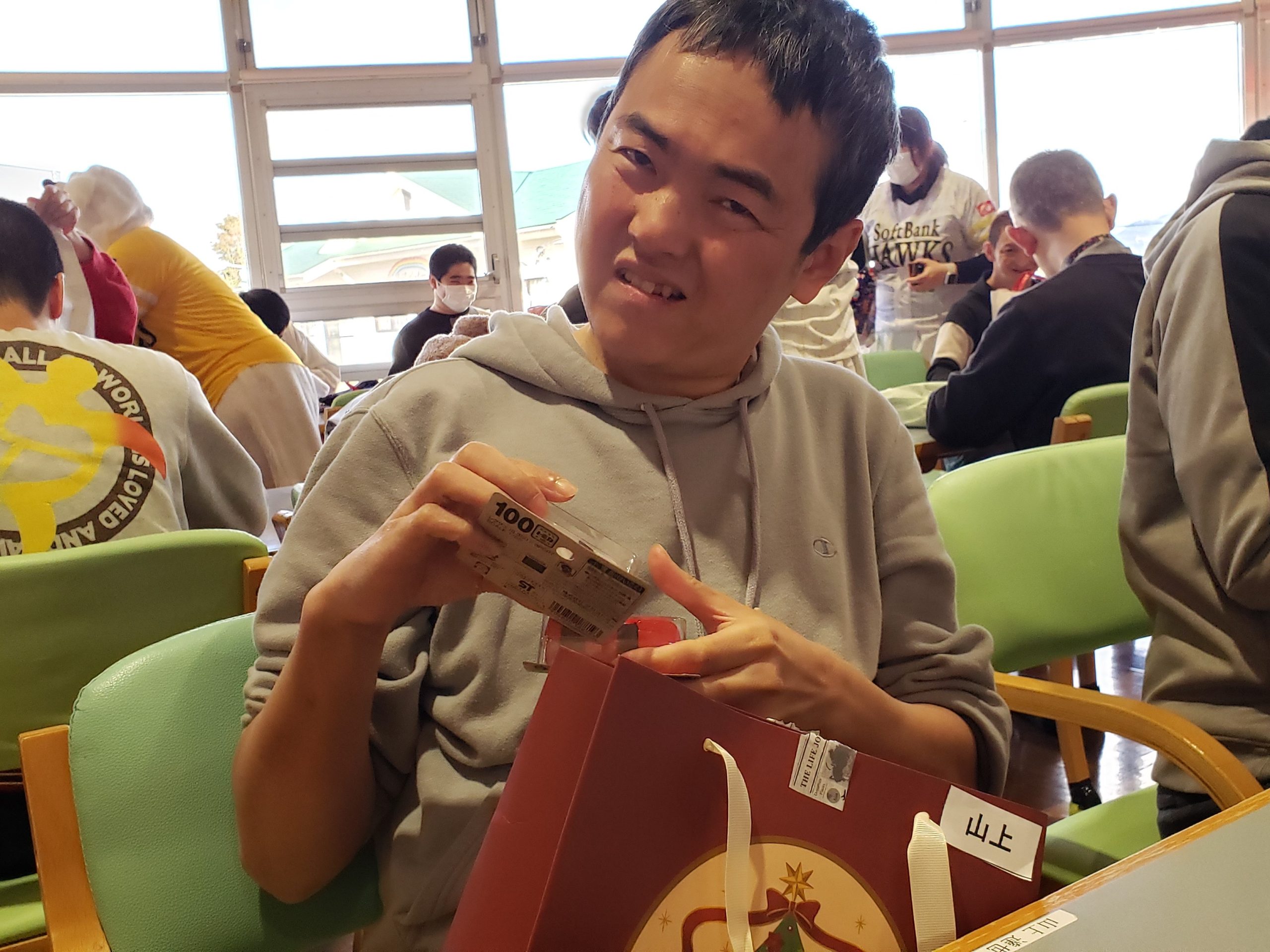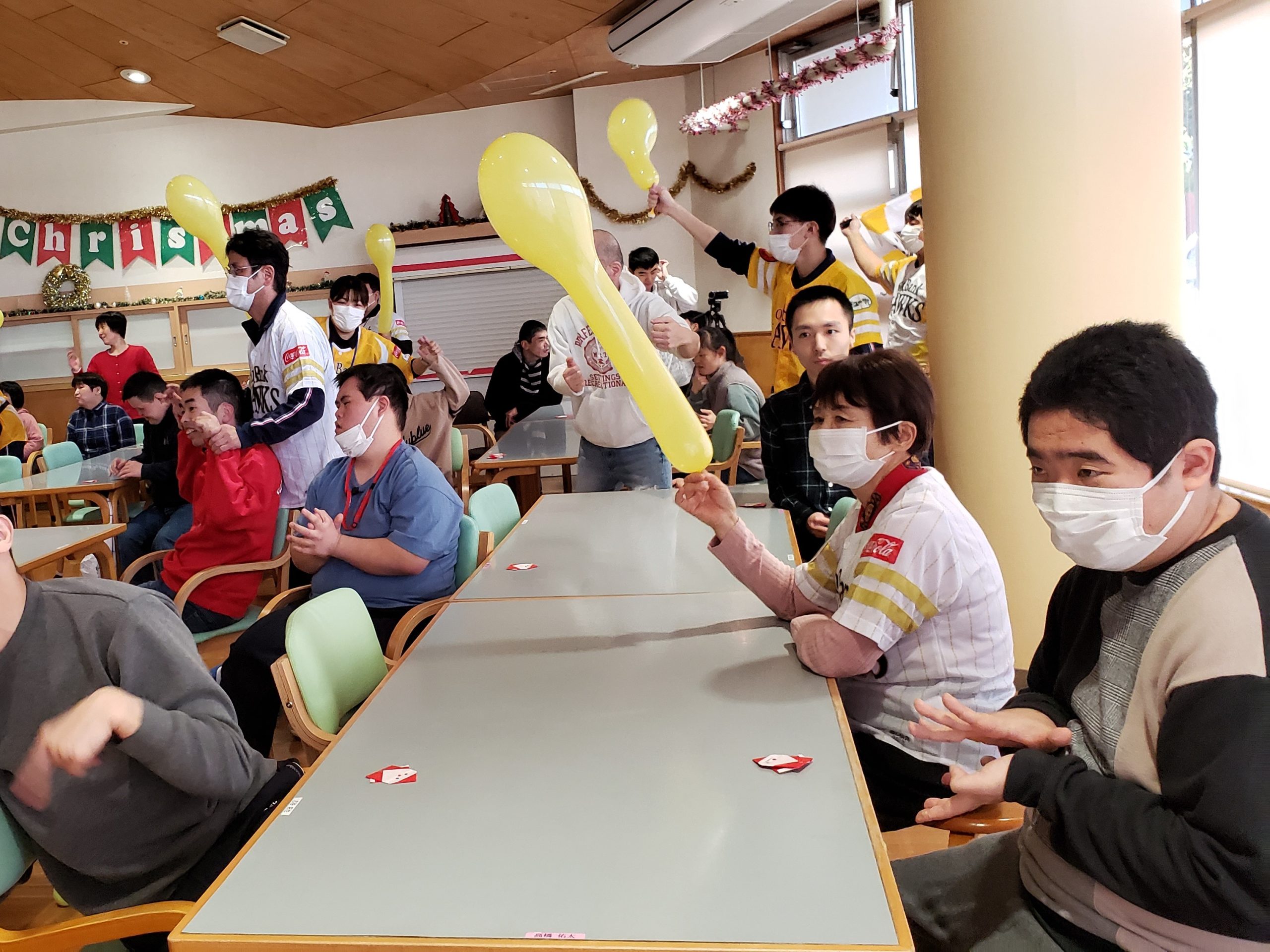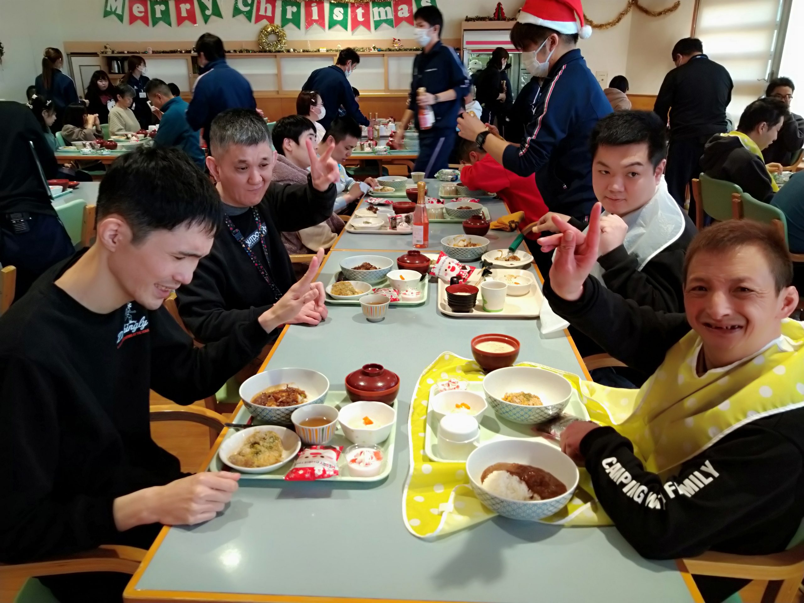 12月23日(月)嘉麻事業所にて毎年恒例クリスマス会を開催しました(#^^#)午前の部は皆さんによる出し物♬流行りの音楽に合わせて太鼓の演奏やダンスを踊る等して会場をおおいに盛り上げて頂きました!その後は豪華な昼食とおやつを食べ、午後の部からは職員による出し物開始!まずは歌のお姉さん、体操のお姉さんによる歌・踊りの出し物♪皆さんプレゼントを頂いたり、一緒に踊ったりと楽しいひと時となりました。2番目の出し物はソフトバンクホークス応援団のチアリーディング(*’▽’)こちらも皆さん大盛り上がりとなり、終盤には今宮選手からのつばさ学園へ向けたサプライズビデオレターが流れ、皆さん大興奮されていました。最後には恒例のサンタ・トナカイによるプレゼント贈呈♬それぞれ願いを込めたプレゼントが届いたようで、とても嬉しそうな様子を見る事が出来ました(*’▽’)